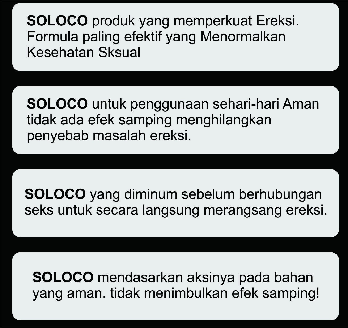 bahan-bahan yang terkandung dalam SOLOCO membantu dalam mencapai hasil terbaik produk unik berdasarkan komposisi bahan alami yang 100% aman SOLOCO adalah solusi terbaik untuk masalah pria!
